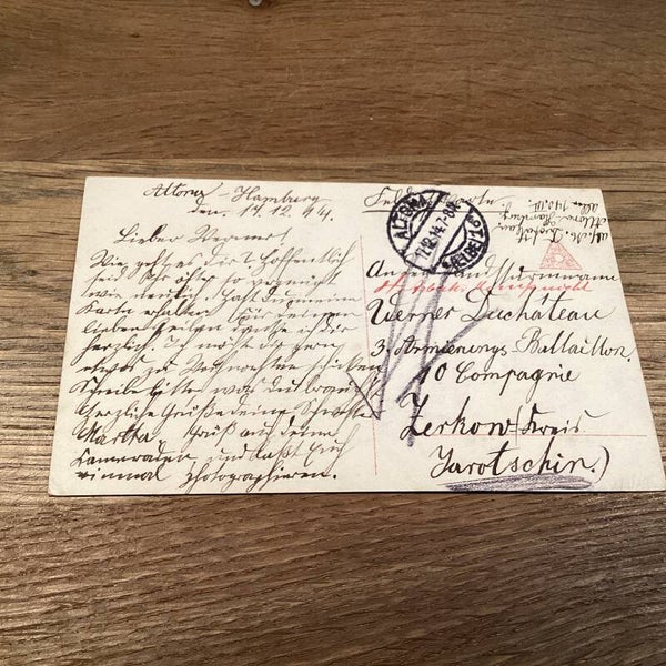 Antieke kerstkaart moeder en kind, vader soldaat, 1914