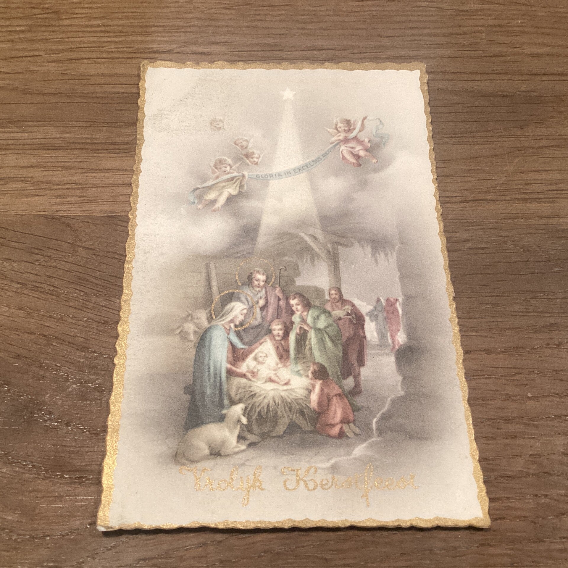 Antieke kerstkaart engelen in kerststal, met gegolfde gouden rand, begin 1900 onbeschreven