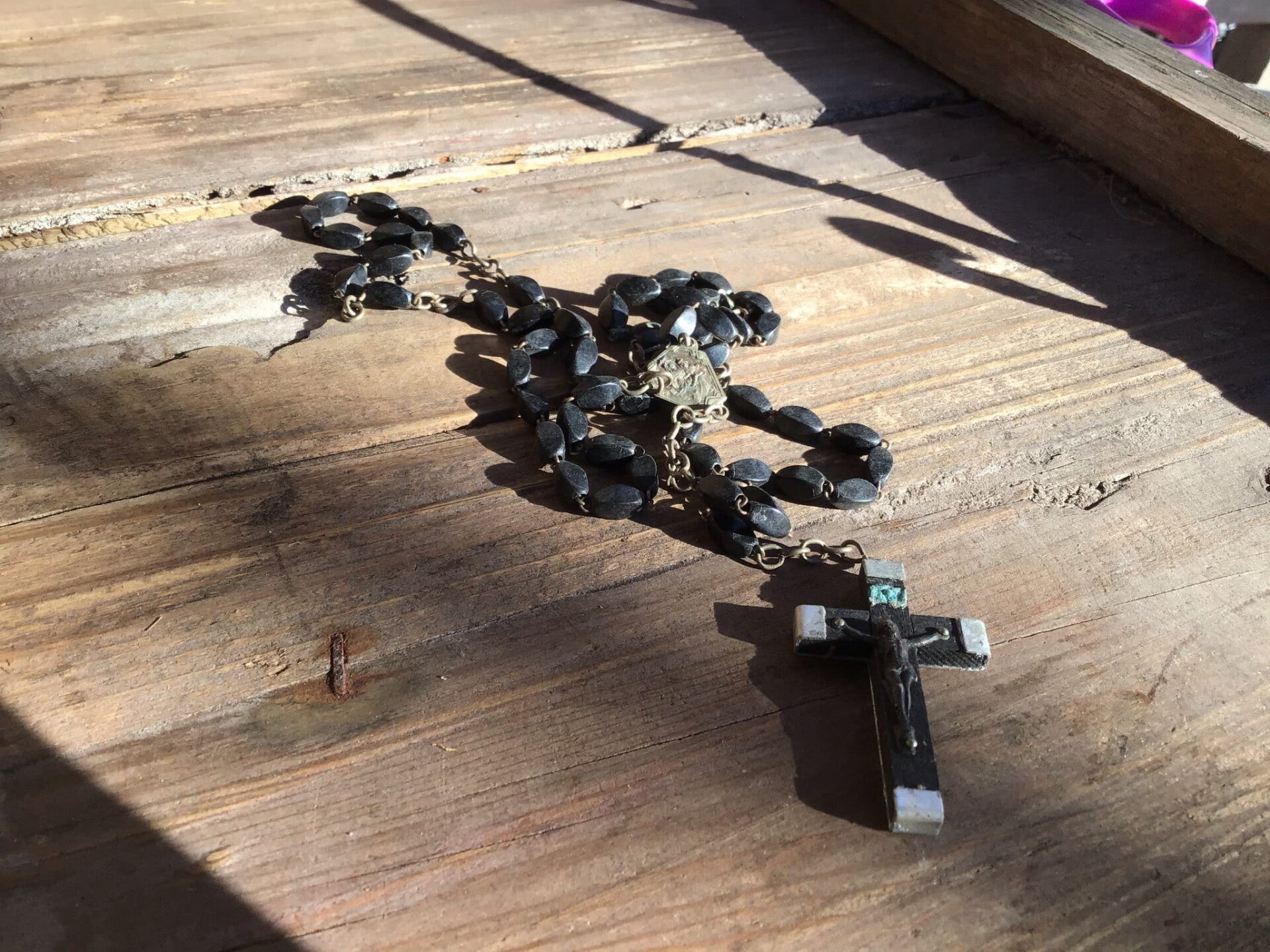 Antieke rozenkrans 50-60 cm zwarte rechthoekige glanzende kralen Maria-Jezus medaillon