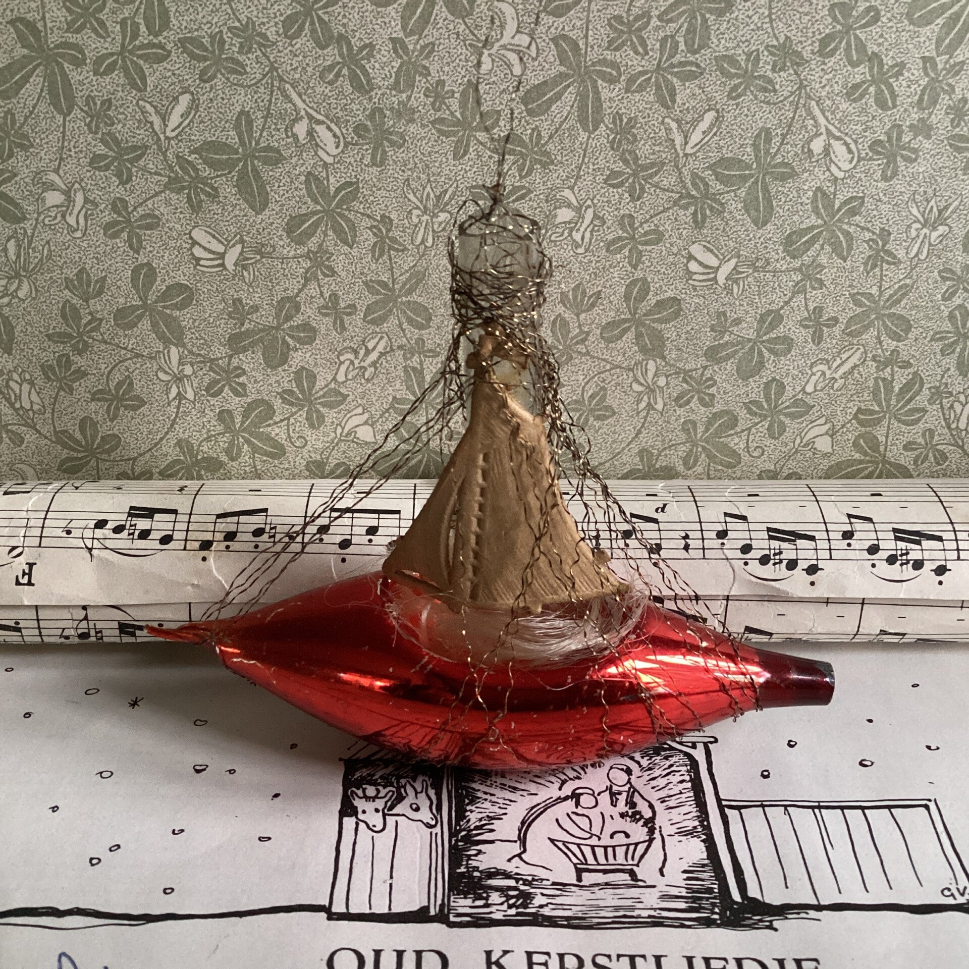 Antieke kerstbal zeilbootje met dresden papier 11x8x3 cm